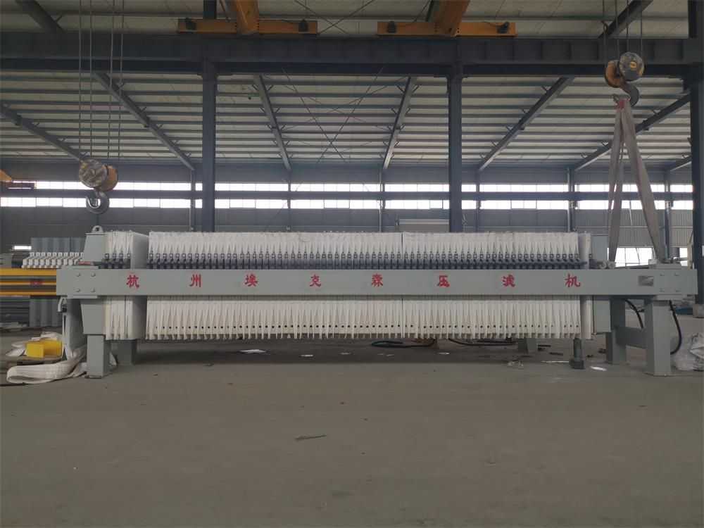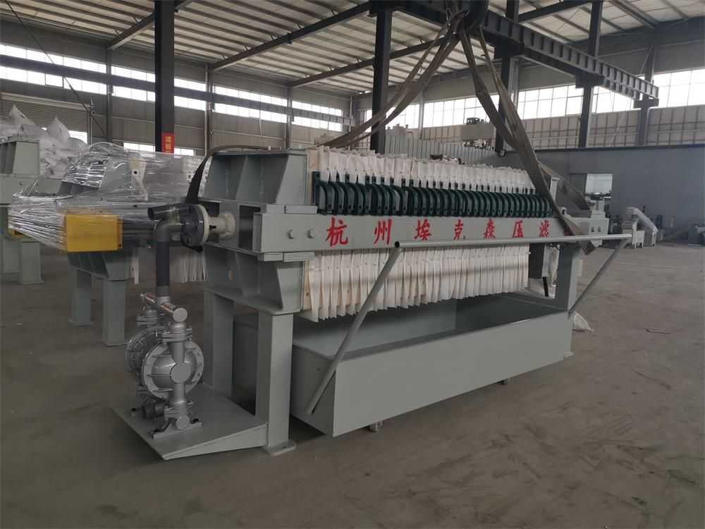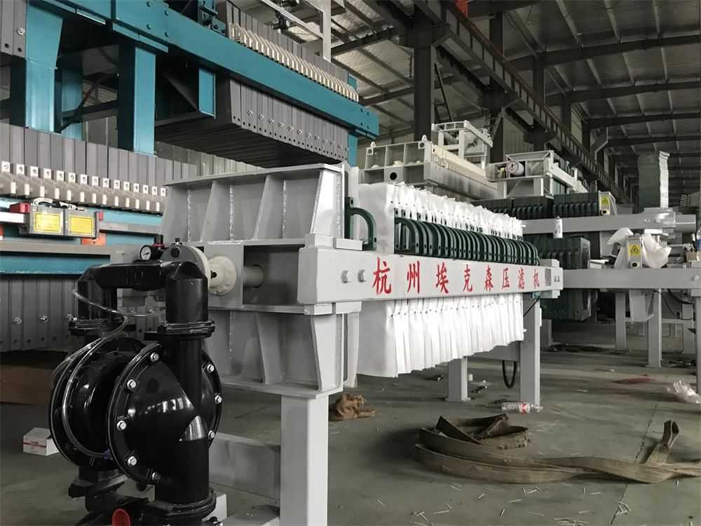 隔膜壓濾機和常規箱式壓濾機的主要區別在于,在濾板的兩側都增加了兩個彈性膜(復合橡膠膜是一個整體式膜。在操作期間,當進料完成時,將高壓流體介質注入膜中,并使整個膜膨脹以過濾濾餅,以進一步使濾餅脫水,這是壓力過濾。在隔膜壓濾機運行期間,液壓系統使用液壓油作為壓力載體來傳遞內部壓力。
